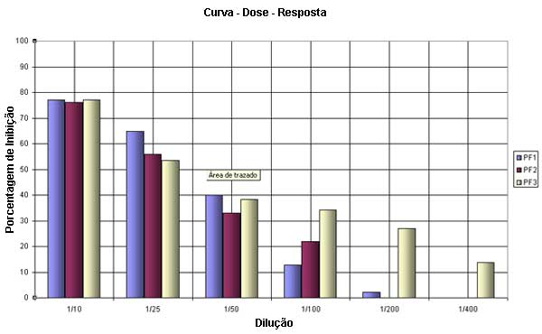 Novamente tal como se aprecia no Quadro 1: “Inibição do crescimento em líneas celulares BW em 24 horas”, a diluções maiores os sucessivas porcentagens de inibição foram decrescentes, resultando a maior efetividade da formulação PF3.